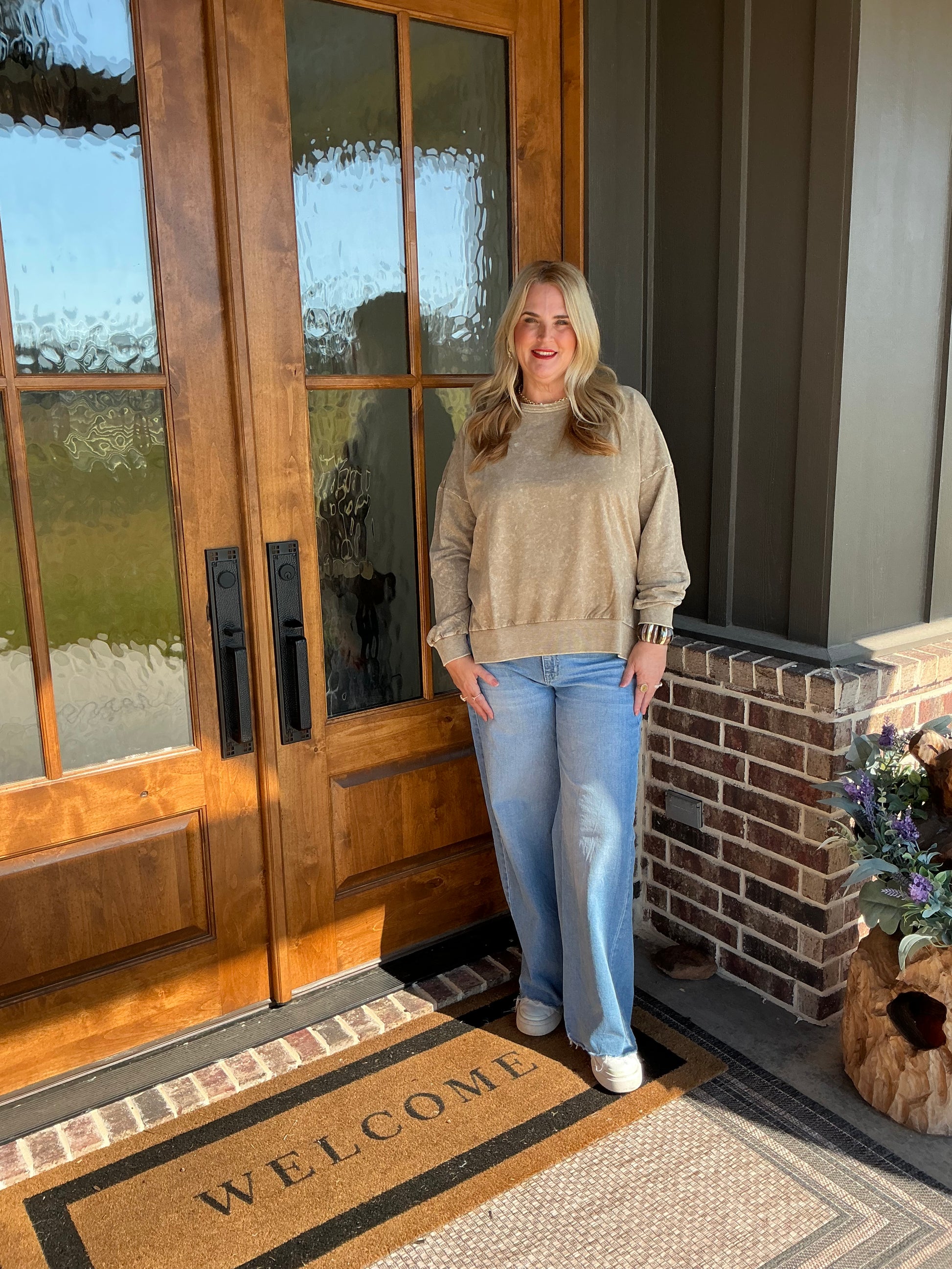 The Whitley Mocha Washed Side Split Long Sleeve Knit Top
